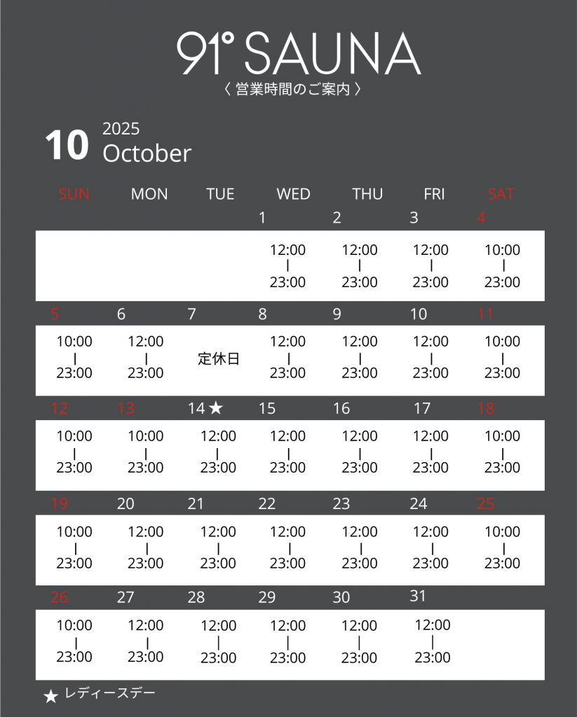 ● 91° SAUNA(12F)は通常男性専用フロアです。女性の方はレディースデーをご利用ください。