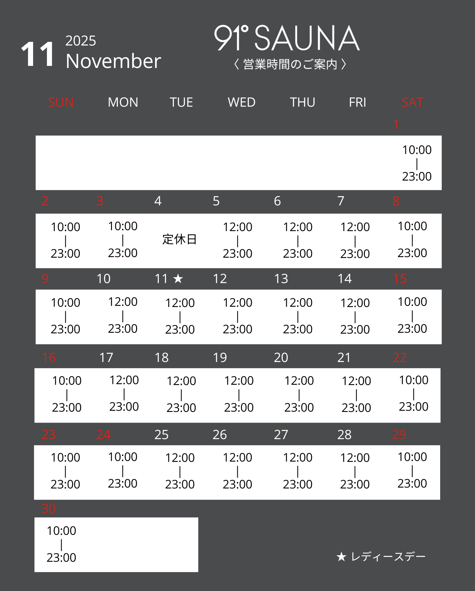 ▶︎ 平 日 12:00 – 23:00 ▶︎ レディースデー:11月11日(火)